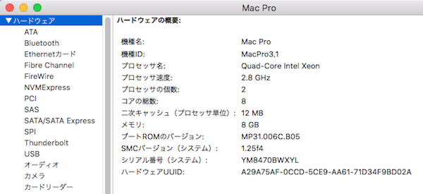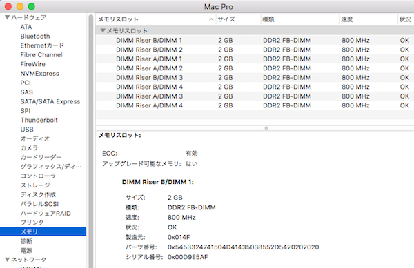 ■2008/1/10発売 Mac Pro (Early 2008) MA970J/A 機種ID:MacPro3,1 モデルナンバー:A1186 EMC 2180 2.8GHz 8 Core Xeon E5462x2 TDP 80W、5400チップセット LGA 771 OS X 10.11 El Capitanまで対応 発売当初 OS X v10.5 Leopard 320GB~1TBのSATA HDDを 4基のドライブベイに搭載可能 ドライブのインターフェースは SATA 2.0 (3Gbps、最大300MB/s) 2枚のメモリライザカードに8つのFB-DIMMスロット 1枚のカードに4つのスロット 最大32GBのメインメモリをサポート 240pin DDR2-800 PC2-6400 (またはPC2-5300) FB-DIMM ECC PCI Express スロット PCIe 2.0 x16スロットが2基 (1基はビデオカード装着済み) PCIe 1.1 x4スロットが2基 PCIe 2.0対応カードを使用する場合、x1のカードでもフルスピードを発揮させるためには、PCIe 2.0 x16スロットに装着する必要があるとされている。 複数のカードを使用する場合は、高速カードをx16スロットに装着 消費電力の合計は300Wまで 独立した 10/100/1000BASE-T Ethernet (RJ-45) インターフェイス2基 Bluetooth 2.0 + EDR (最大3Mb/s) 16倍速SuperDrive DVD±R DL/DVD±RW/CD-RW 重量(標準構成):19.2kg 高さ:51.1cm 幅:20.6cm 奥行き:47.5cm 《↑TOP》 |