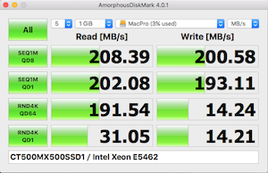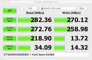 調べたらMacProのシリアルポートはSATA2(Serial ATA 3Gb/s)で、SSDはSATA3、使用したのはCrucial SSD 500GB MX500(Serial ATA 6Gb/s)。