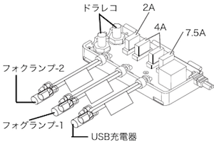 フォグランプ、USB スマホ 充電器、 バイク専用ドライブレコーダーとバッテリーの端子から次々と電源を取っていたったため、配線でゴチャゴチャになってしまった。そのため整理することにした。デイトナのD-UNITを購入してみた。