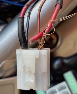 ここでレッカーを呼ぼうと思い、最後にバッテリー周りのケーブルをゆすっていたら 12Vまで跳ね上がった。充電器は壊れていないみたいだ。気を取り直し走り始めるが、ファミリーマート・月形皆楽公園店で再び電圧低下、ここで止まってチェック、ケーブルを揺らしても、電圧が上がらない。ダメ元でレクチャーファヤーのコレクター部分を押し込むと、電圧が復活。 原因は、コネクター(下の写真)の接触不良だった。