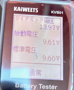 帰宅後、新品バッテリーをフル充電。新品バッテリーをテスターで測ると13.99vだったが、