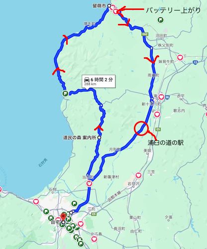 目の前のDCM(ホームセンター)でバッテリーを買うことにする。互換バッテリーがあったが、値段が高い、でもしょうがなく買う。DCMの駐車場で交換、 電圧は12.4Vあったので走り始めるが、やはり充電されない。どんどん電圧が減って行く。なんとか留萌から走りばじめて、浦臼の道の駅に到着。