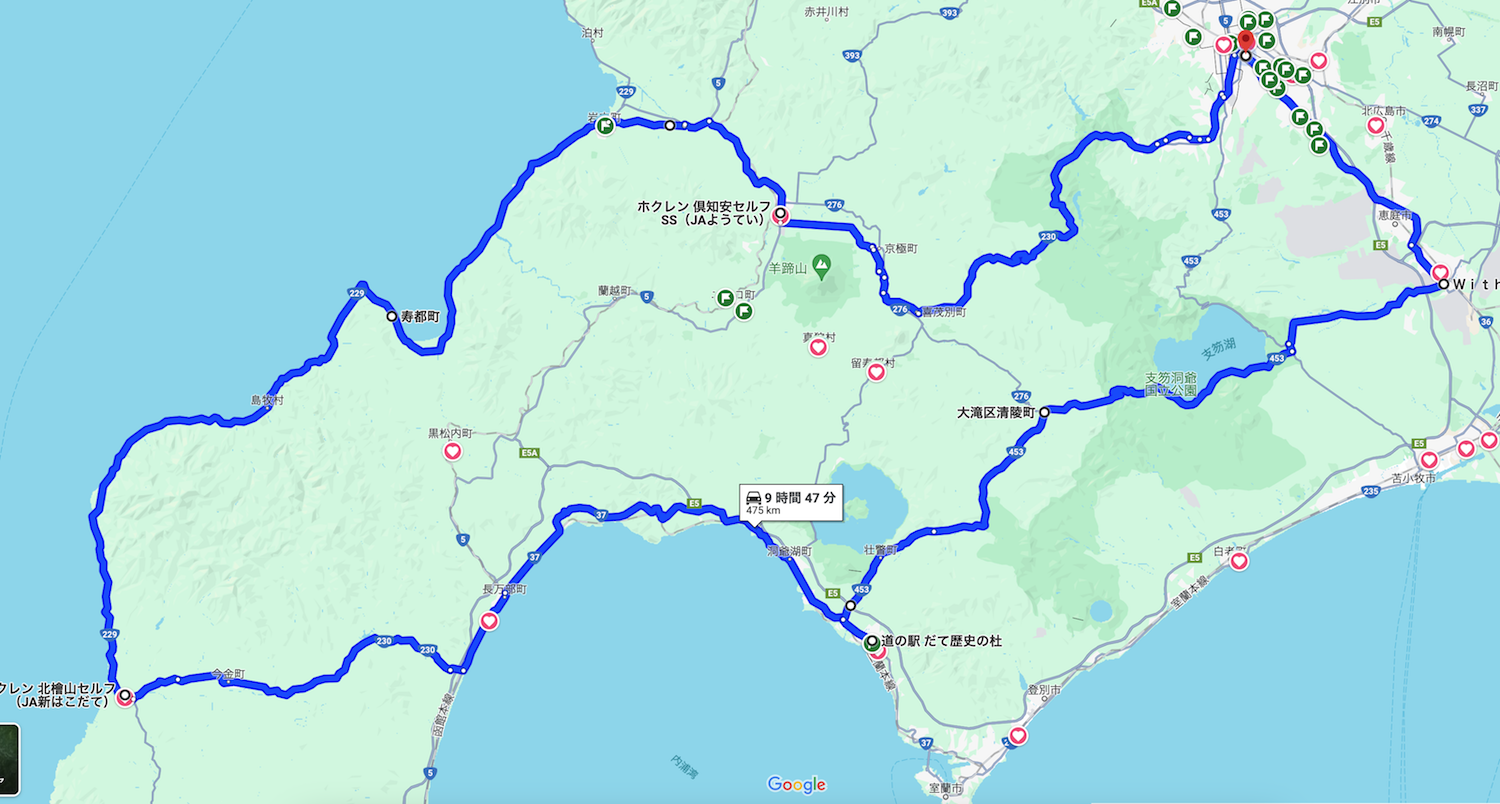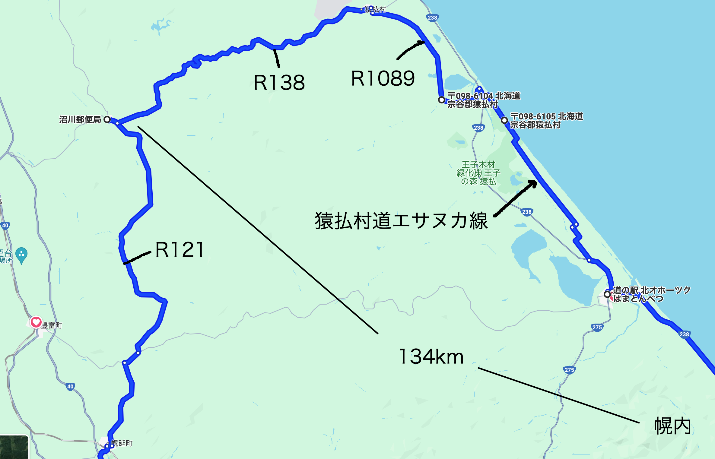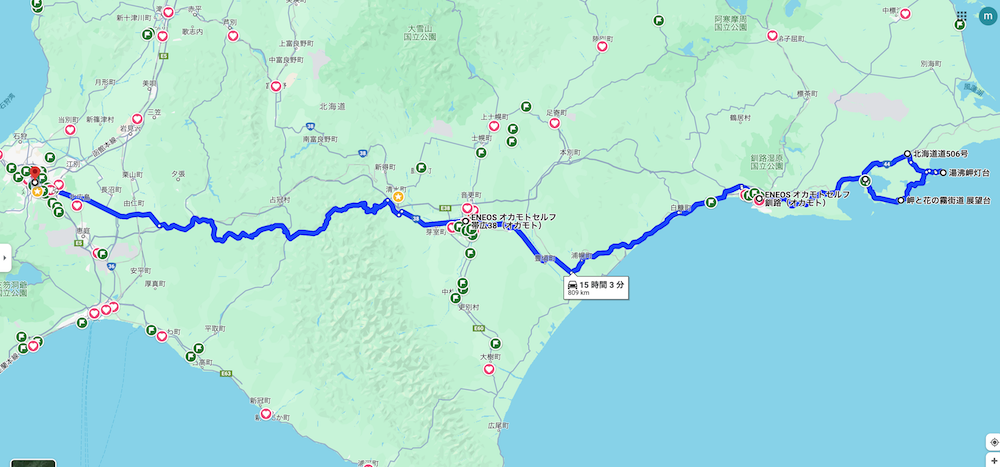 今日は涼しくて、前回と同じ服装では寒かった(長袖の下着、綿のシャツ、フリース、黒のジャンパー、ユニクロの暖パンツ)。また霧が出て夕張あたりでモンベルのカッパの下だけ履いた、さらに途中でモンベルのブルーのカッパを着る。日高町で昼食、天ぷらうどん。日勝峠登りは問題なかったが、下から濃霧、清水まで霧が続く。 上士幌の道の駅で休憩また道の駅でうんこをしてします。最近多い。ここで給油して、名寄、阿寒湖を過ぎて永山峠(国道241号線)あたりからまた濃霧 、永山峠あたりは天気が悪い、弟子屈で休憩。モンベルのカッパは新しい方だったので、ズリ上がり防止バンドをつけていないので少し、靴の中に水が入った、くそだな。靴は防水ブーツで正解。弟子屈から中標津に向かう。まだこの辺りは寒くて、走るのが辛い。中標津のすき家で食事、給油、DCMの大きな駐車場で着れる物を全部着る。綿のシャツの上にダウン、フリース、黒のジャンパー、モンベルのカッパ。暖パンツの上に、ワークマンのオーバーパンツ、モンベルのカッパ 。電熱グローブ、着膨れでパンパン。もう冬と変わらない。そのまま標津から斜里、道の駅で休憩。ナビでルートを設定すると網走経由が早いとなっていたので、そのルートを選ぶ。北見に向かい給油、留辺蘂の道の駅で休憩、みるみるうちに霧が出てきた。ここで腹ごしらえにウイダインゼリー、カロリーメイトを食べる。気温は中標津から比べるとだいぶ暖かい。旭川に向けて、霧の中出発 いつもの当麻の道の駅で休憩。ケツ痛い、眠い、予定していた旭川のアポロはやってなかったので給油できなかったが、R12の宇佐美で給油できた。ここは24時間。