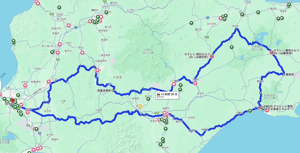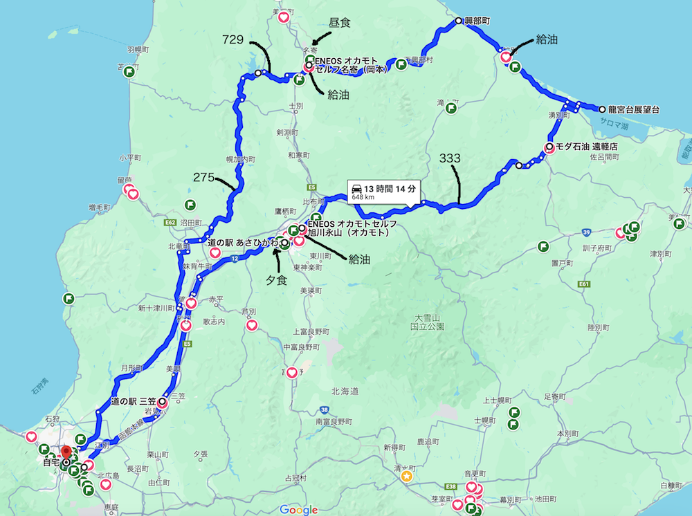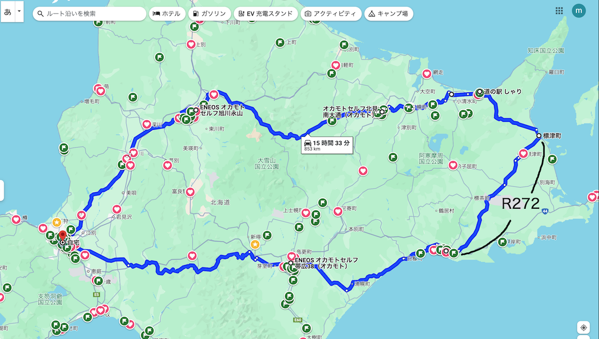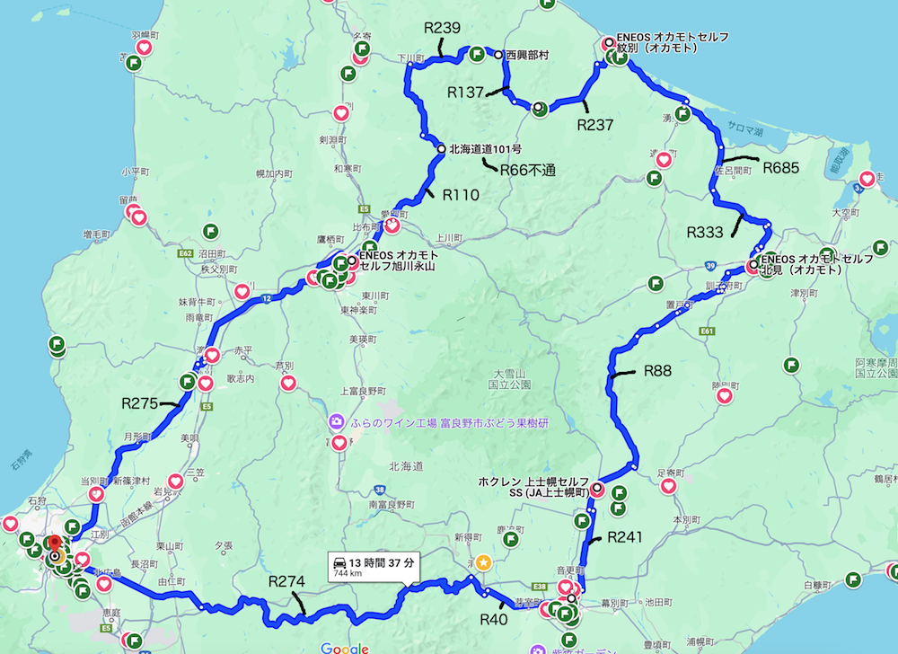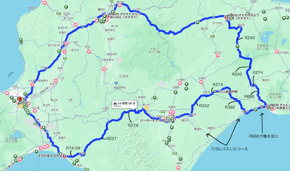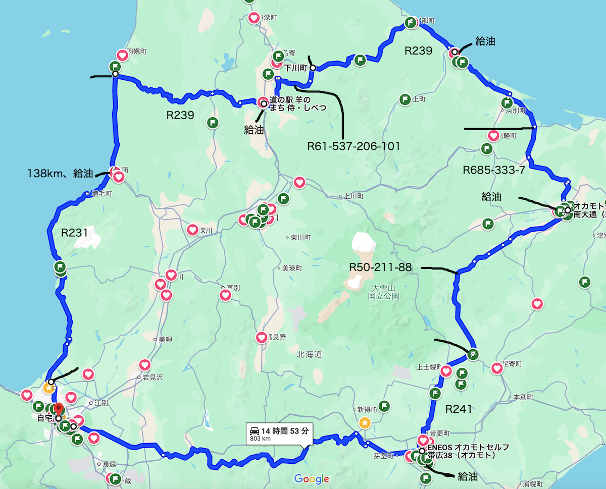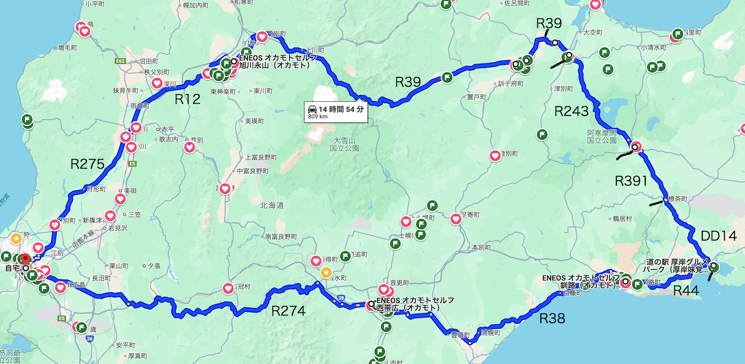 札幌R274—帯広R38—釧路R44—厚岸、368km —美幌まで491km(釧路から171km、釧路--厚岸間は48km)) —北見R39—-旭川まで667km—滝川からR275—自宅まで805km