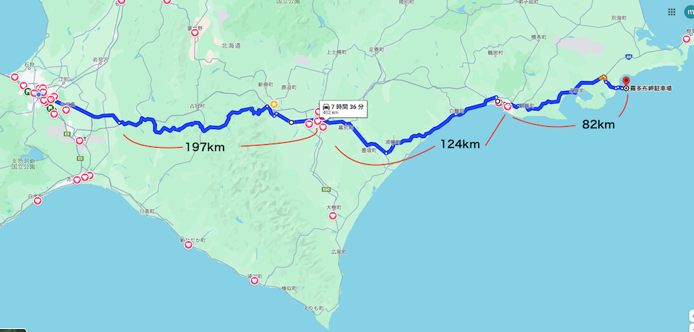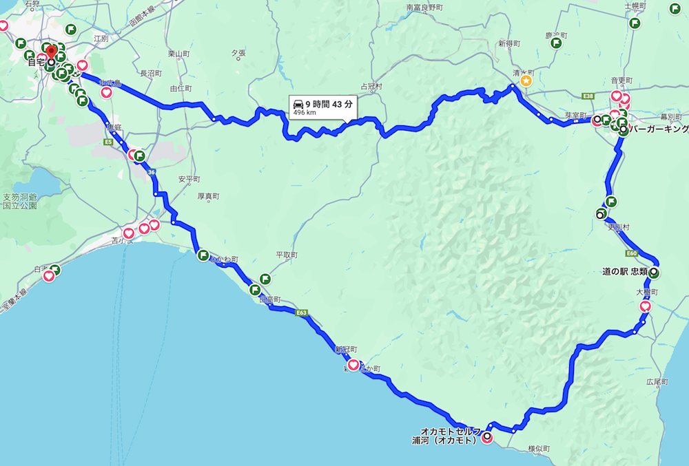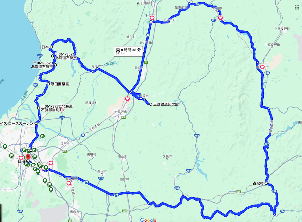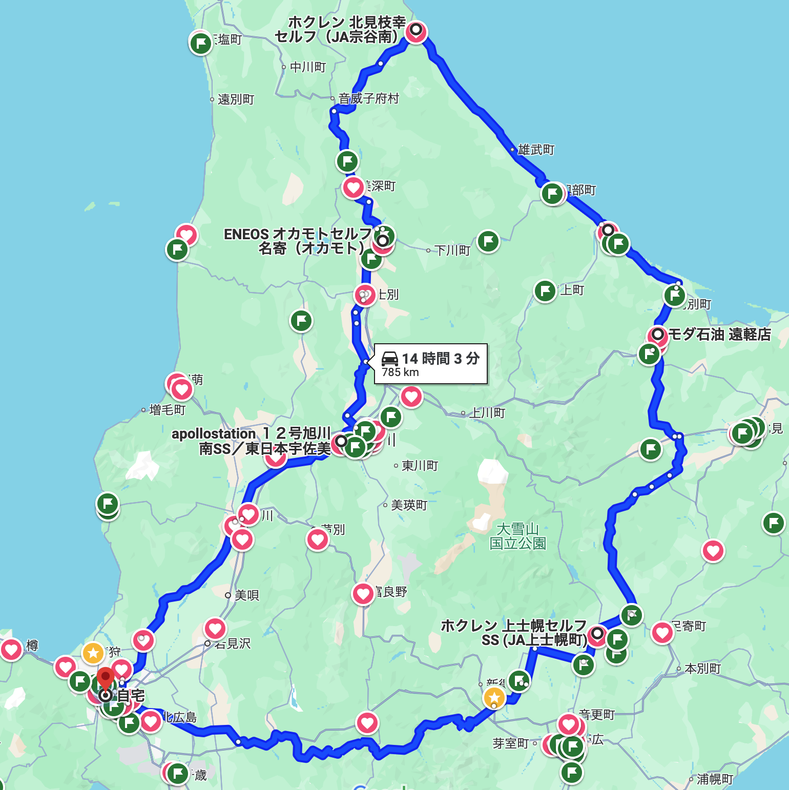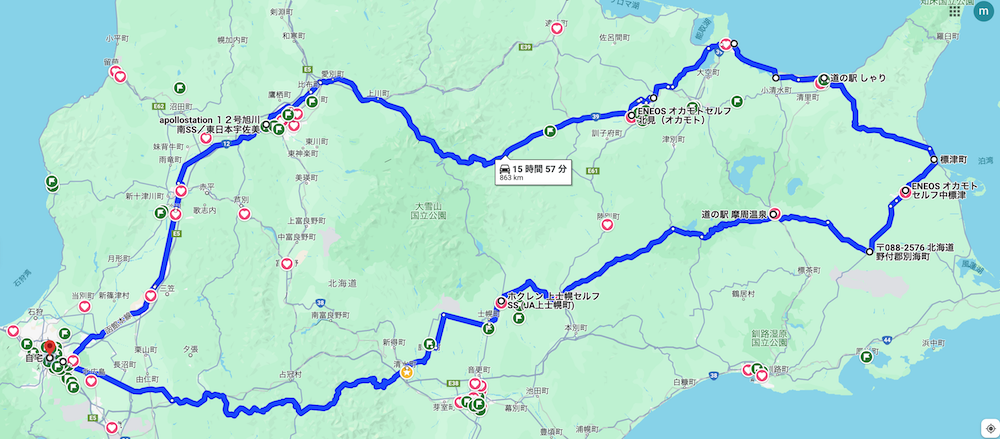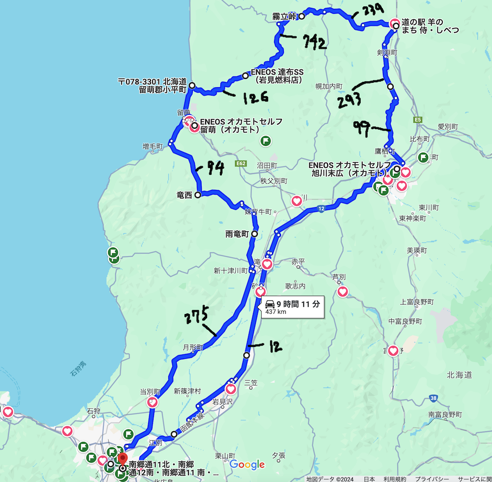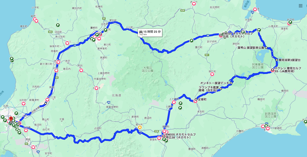 札幌R274—帯広R38—釧路R44—厚岸、368km —美幌まで491km(釧路から171km、釧路--厚岸間は48km)) —北見R39—-旭川まで667km—滝川からR275—自宅まで805km