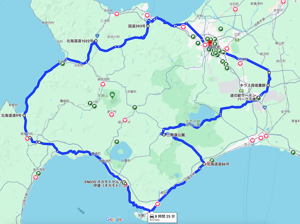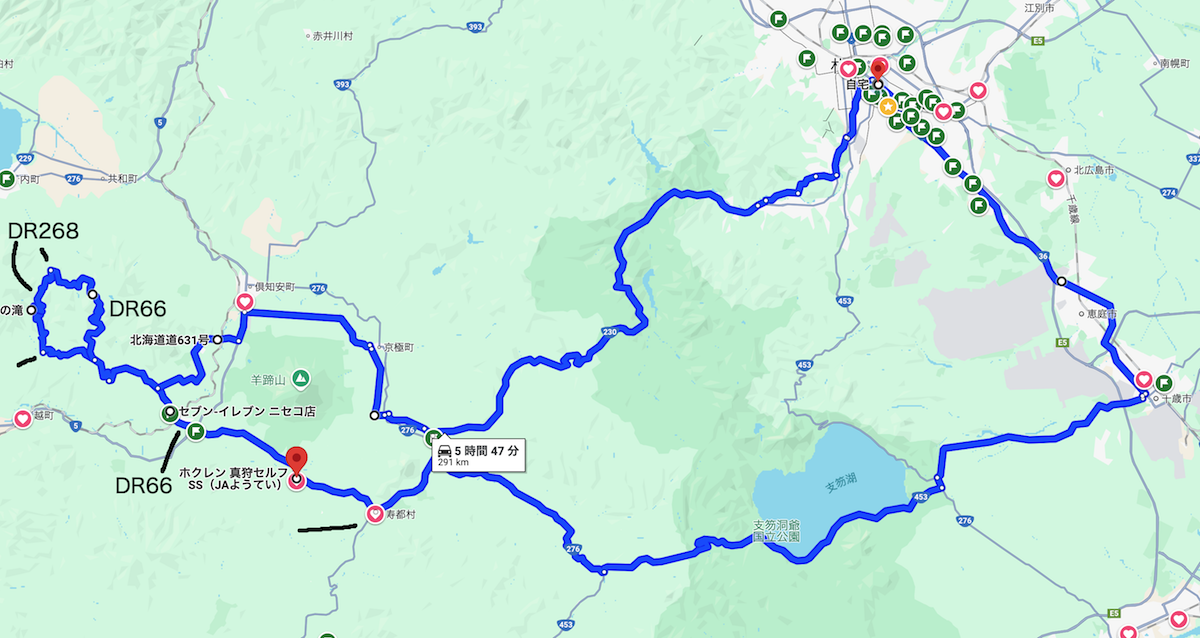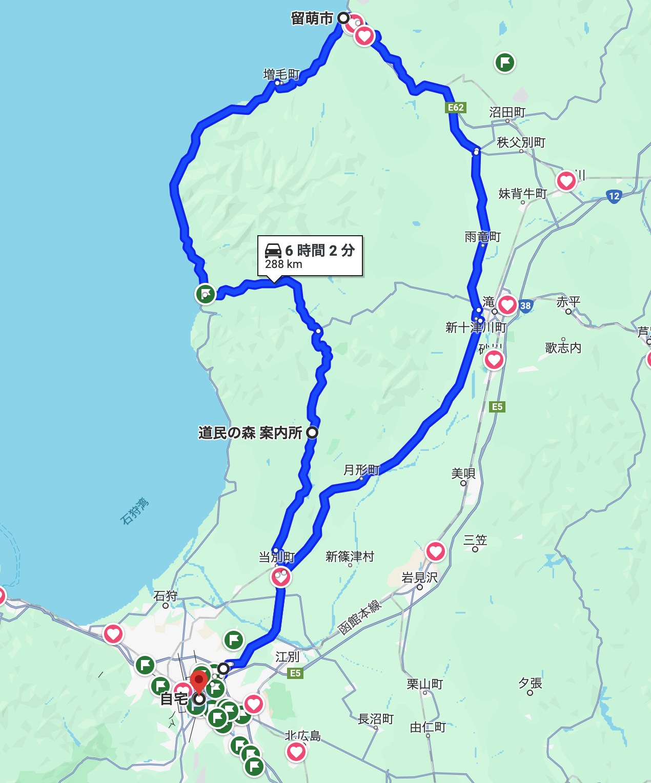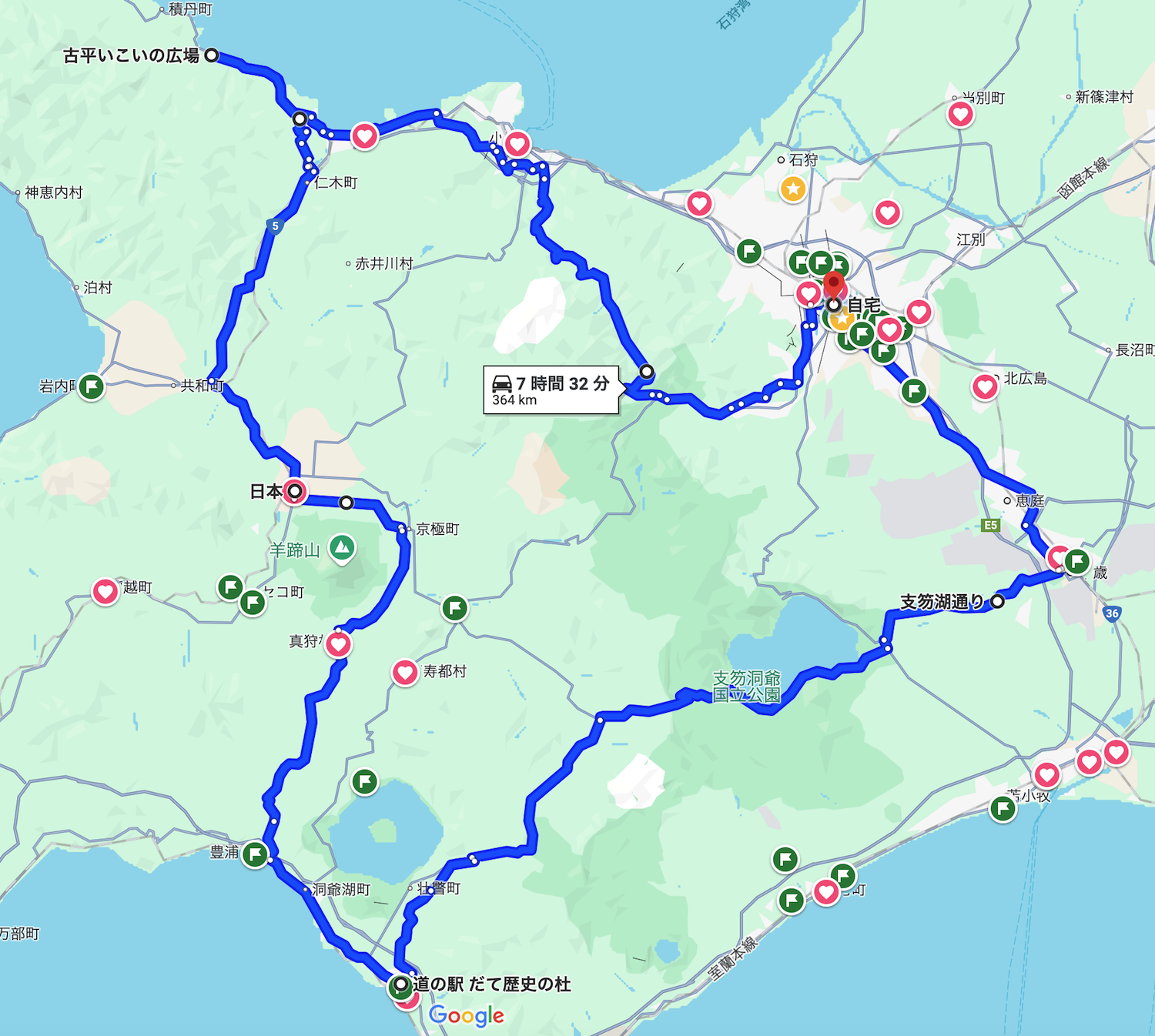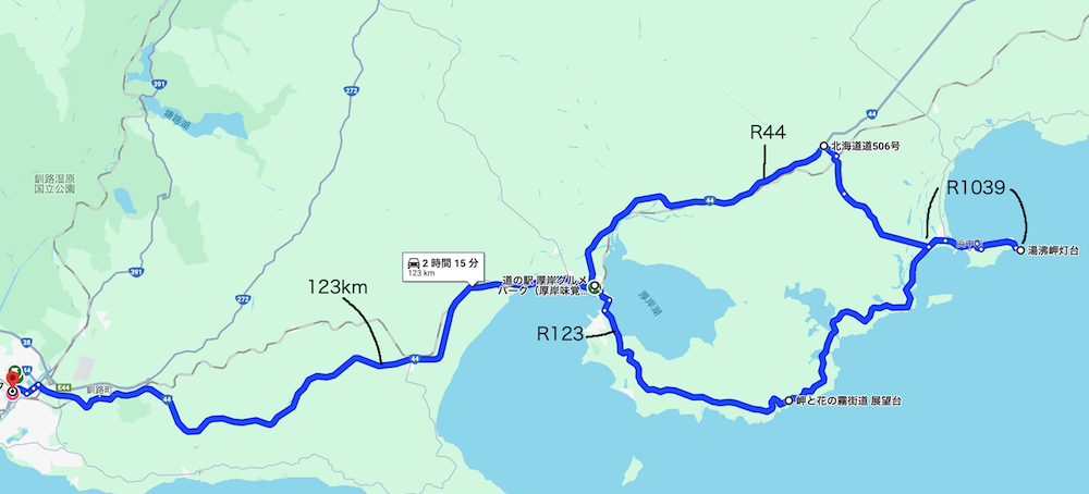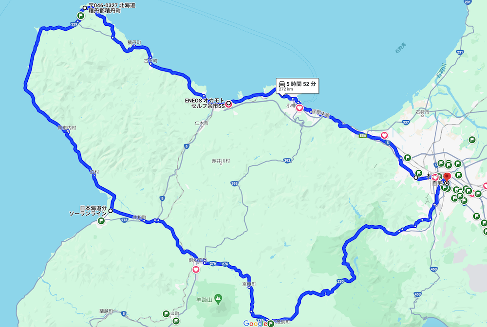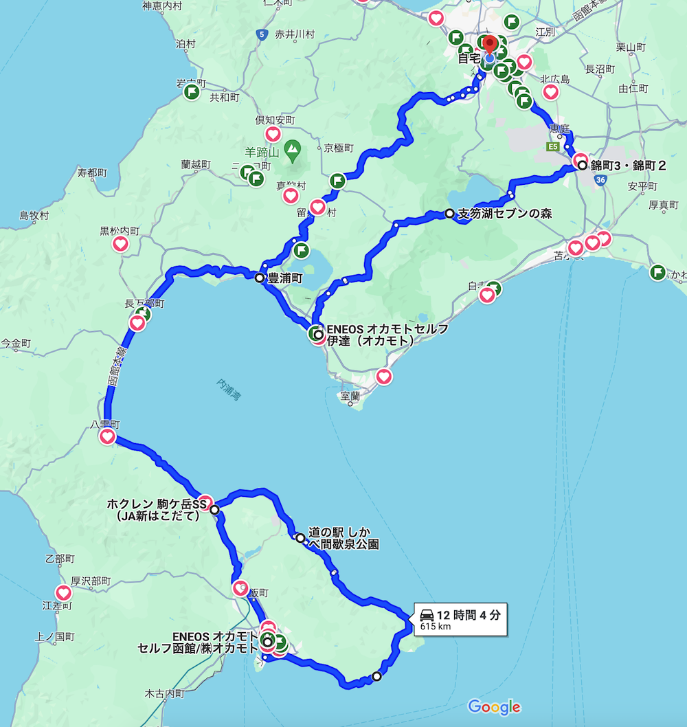 札幌R274—帯広R38—釧路R44—厚岸、368km —美幌まで491km(釧路から171km、釧路--厚岸間は48km)) —北見R39—-旭川まで667km—滝川からR275—自宅まで805km