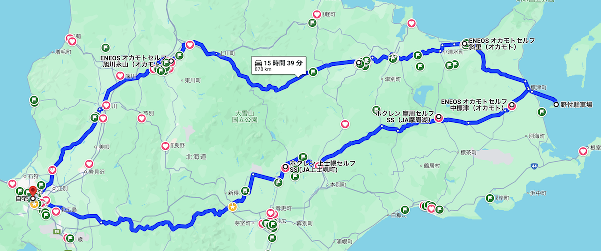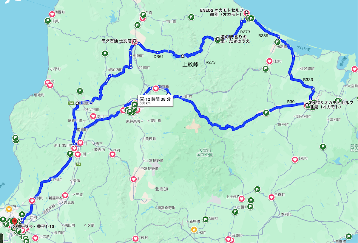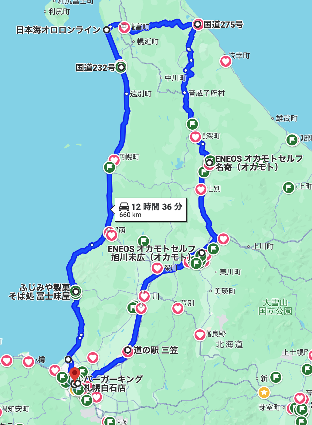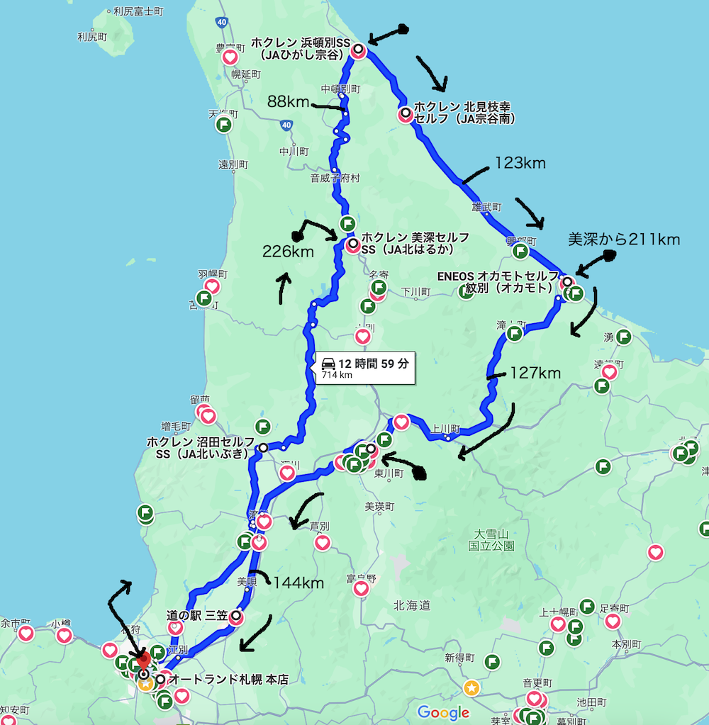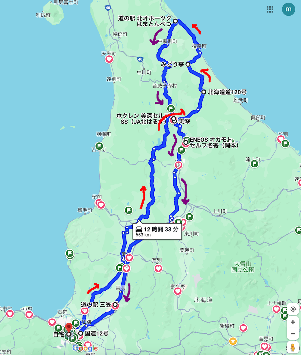 札幌——石狩沼田(111km)—美深(226km・給油)—-浜頓別(314km.16:10)—- 枝幸(346km)----紋別(437km・給油)ご飯19:00-20:00発--当麻の道ら駅に22:2着5--旭川(570km・給油)---札幌(714km、01:35) 約13時間