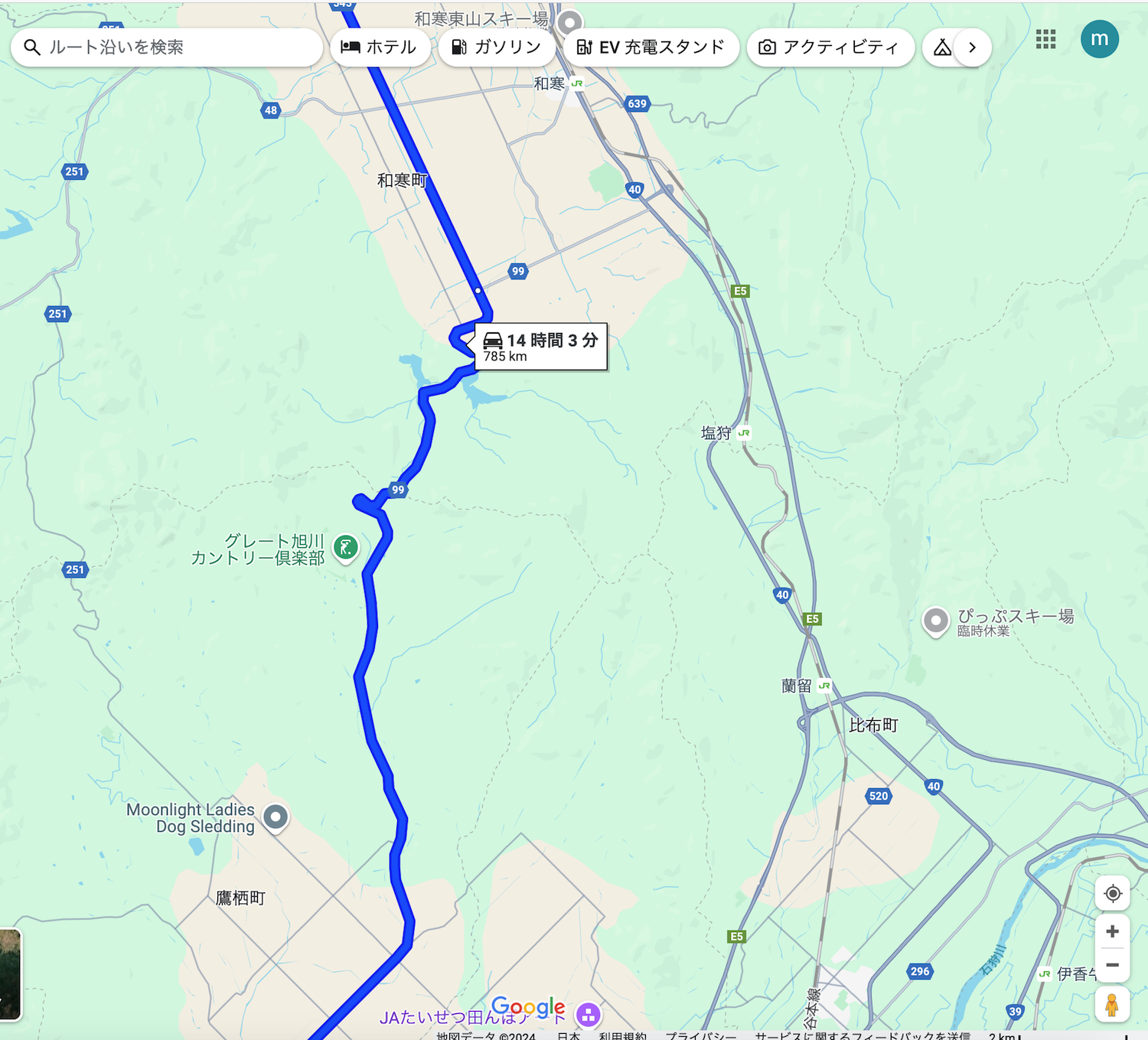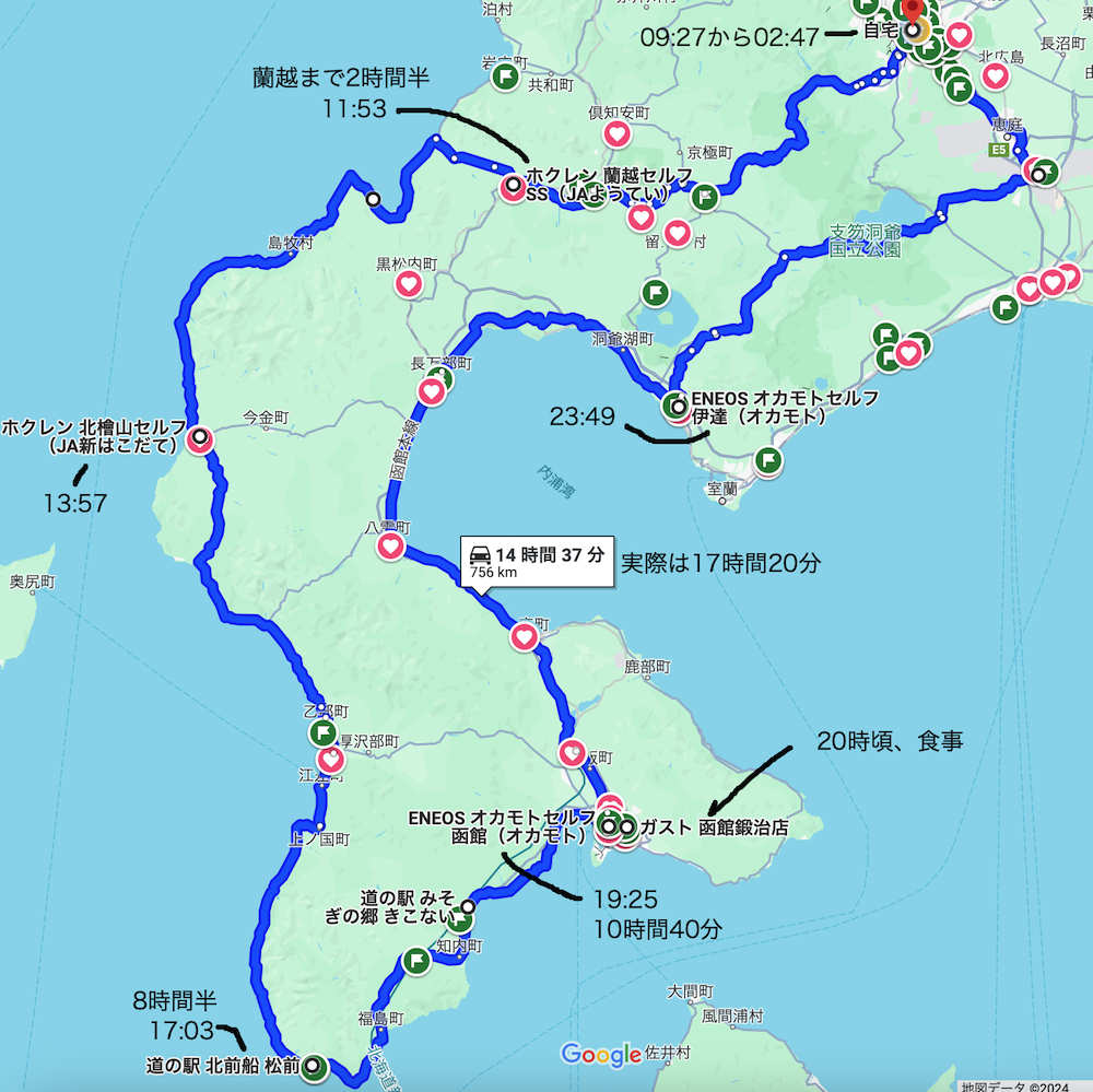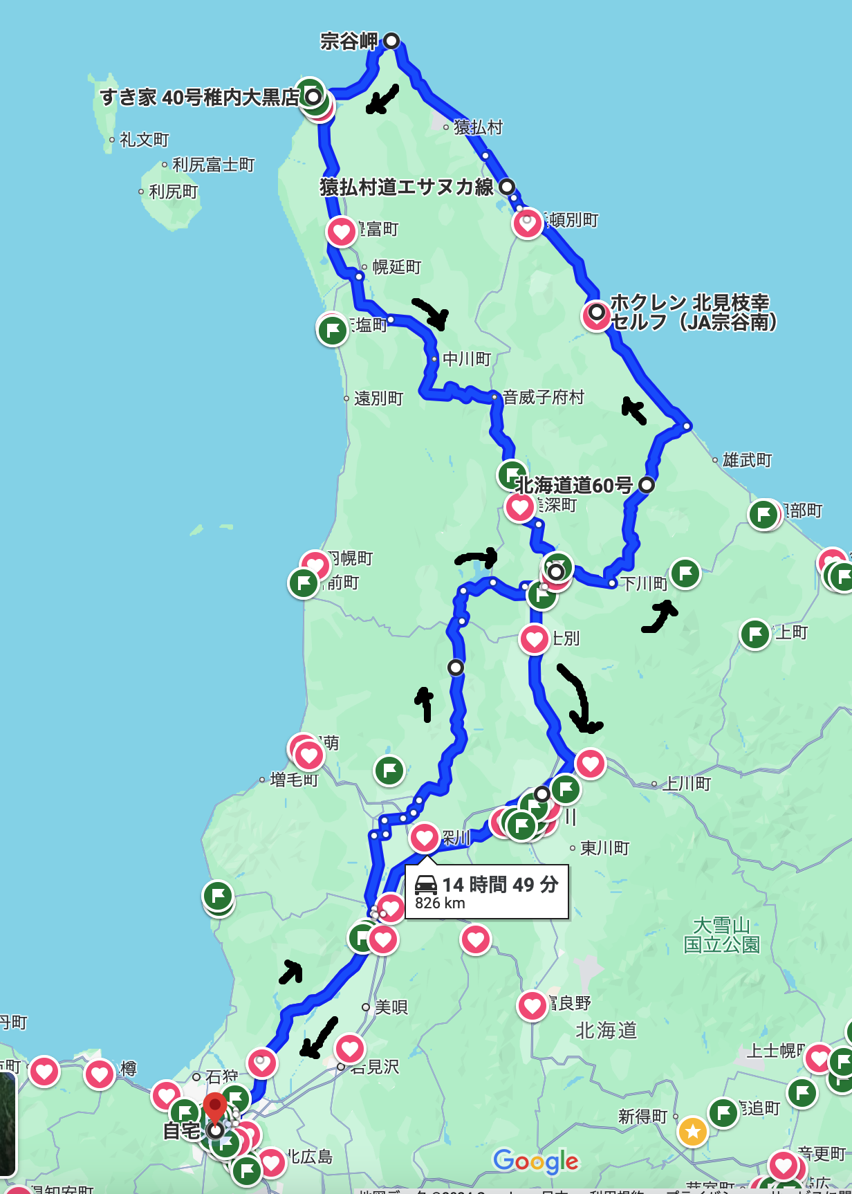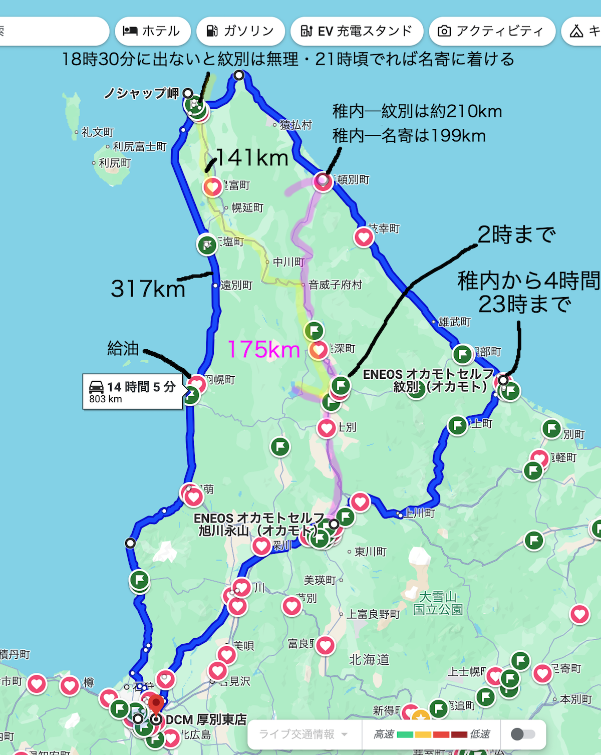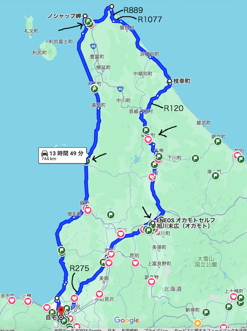 札幌——石狩沼田(111km)—美深(226km・給油)—-浜頓別(314km.16:10)—- 枝幸(346km)----紋別(437km・給油)ご飯19:00-20:00発--当麻の道ら駅に22:2着5--旭川(570km・給油)---札幌(714km、01:35) 約13時間