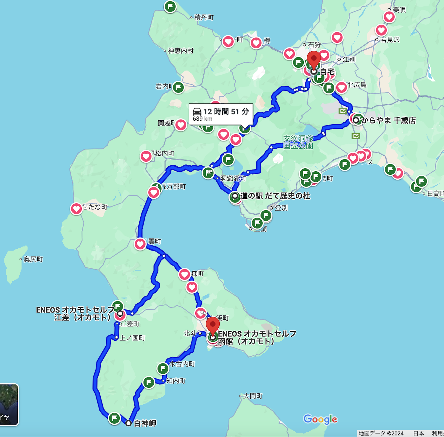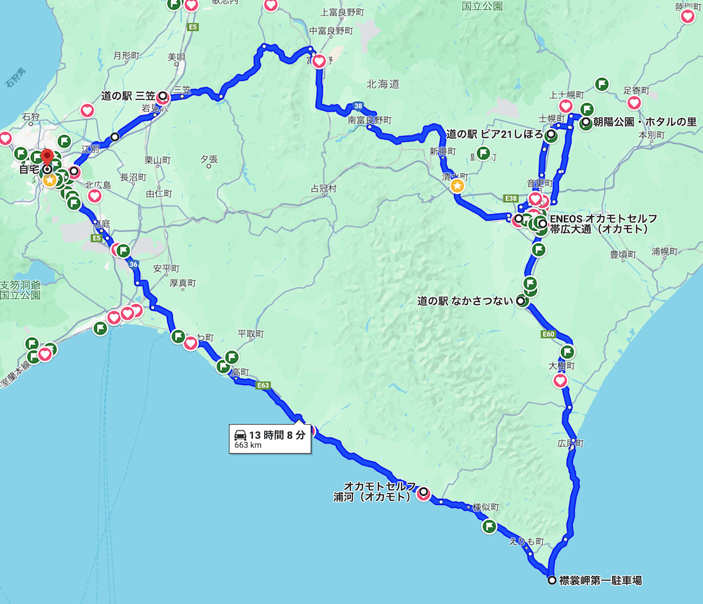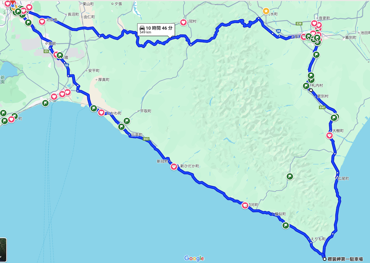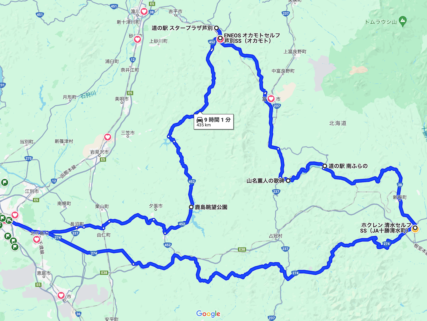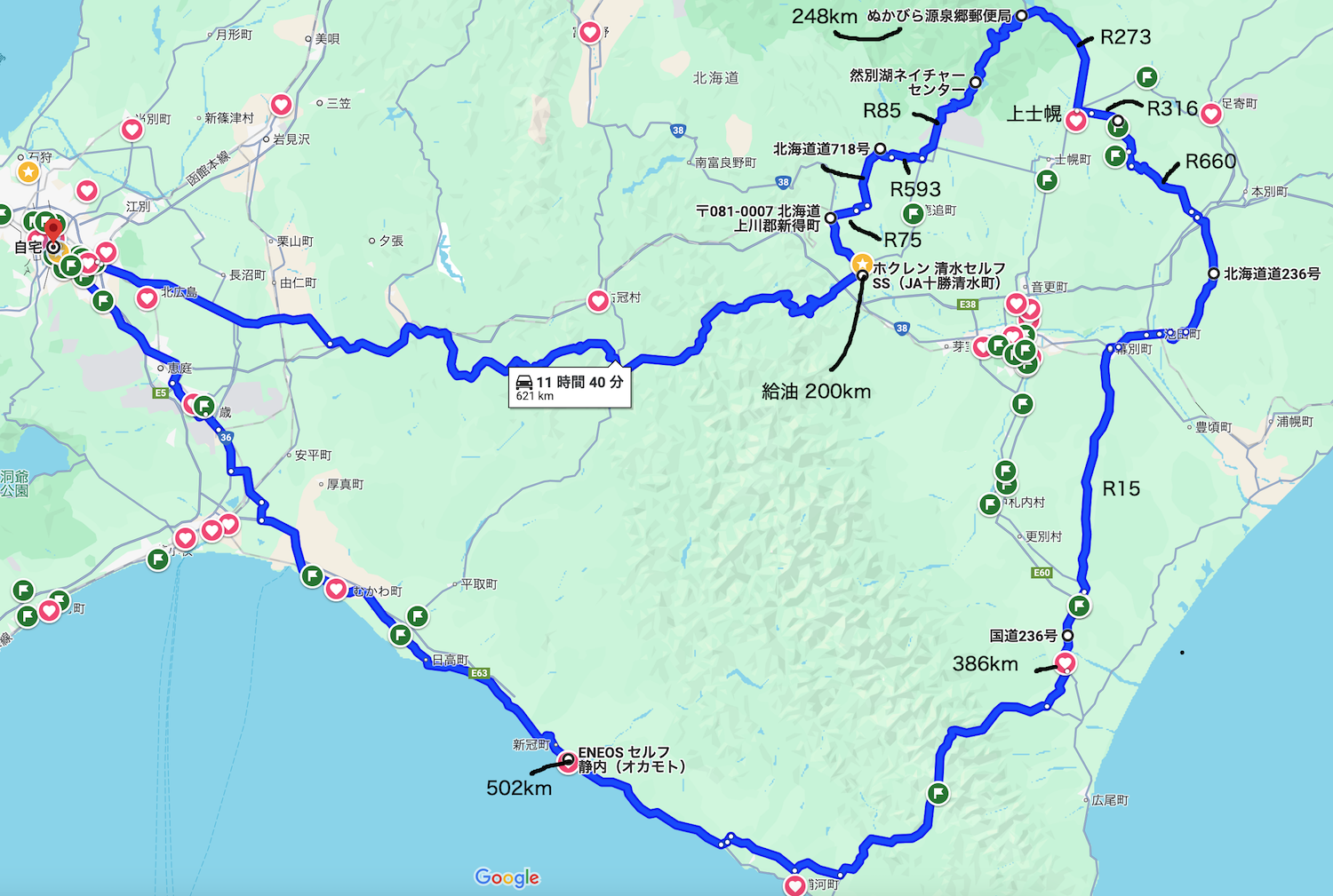 札幌、むかわ、日高、浦川、野塚峠、大樹、中札内、帯広、札幌、98924.7km(499.2km)