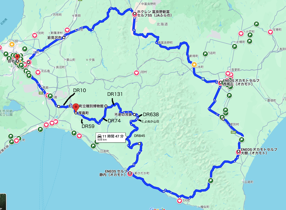 札幌--千歳--浦河(167km・給油)---襟裳岬(15:50、お昼)---大樹---中札内(18:15)---帯広(346km・給油)---朝陽公園・ホタルの里(398km)---帯広(給油)---富良野---桂沢湖---三笠---自宅(638km)