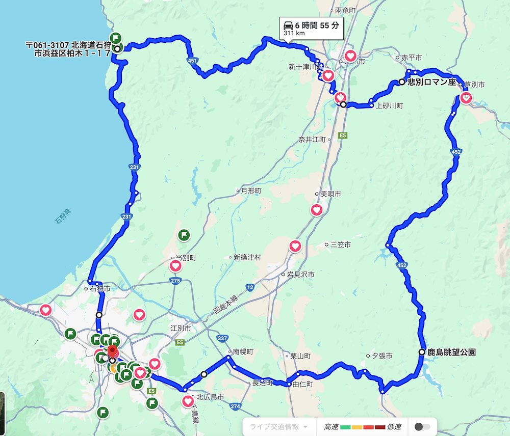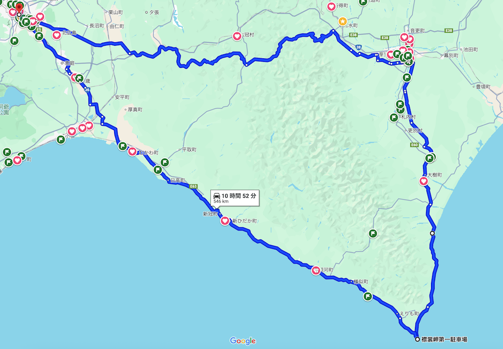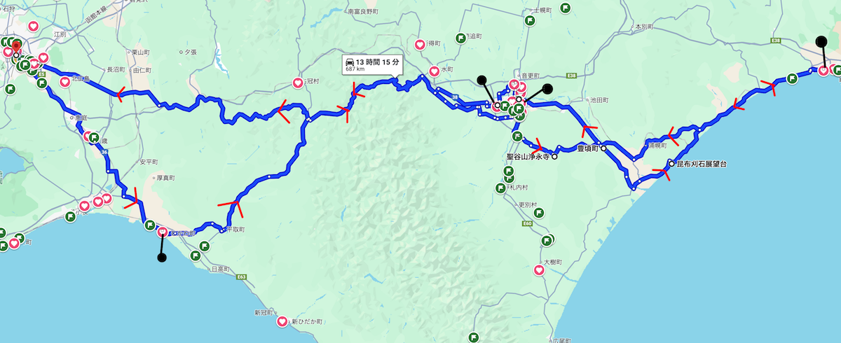 札幌9:43出発—浦河14:09(燃費は39.7km/L)—釧路17:56(35km/L)—帯広20:56—帰宅01:15(35.1km/L) 新日高で12:50お昼、帯広で21時ころ夕食