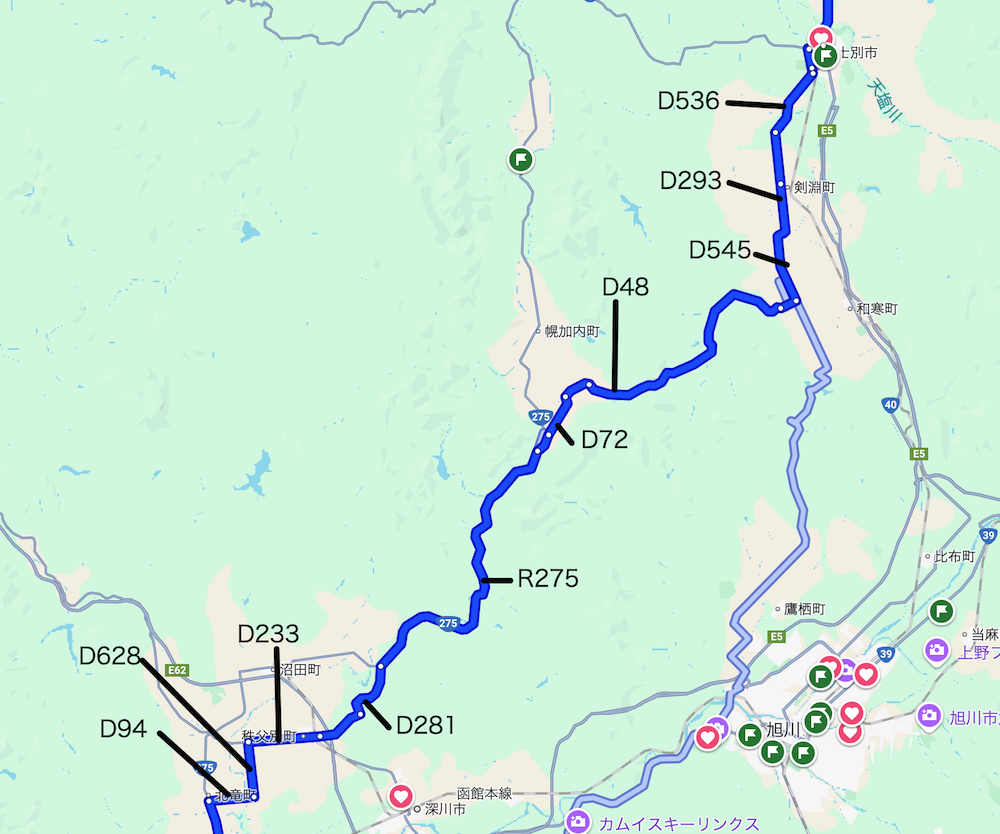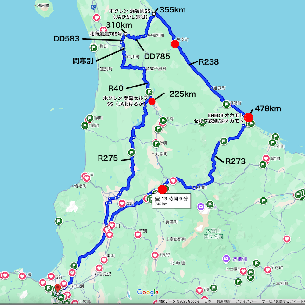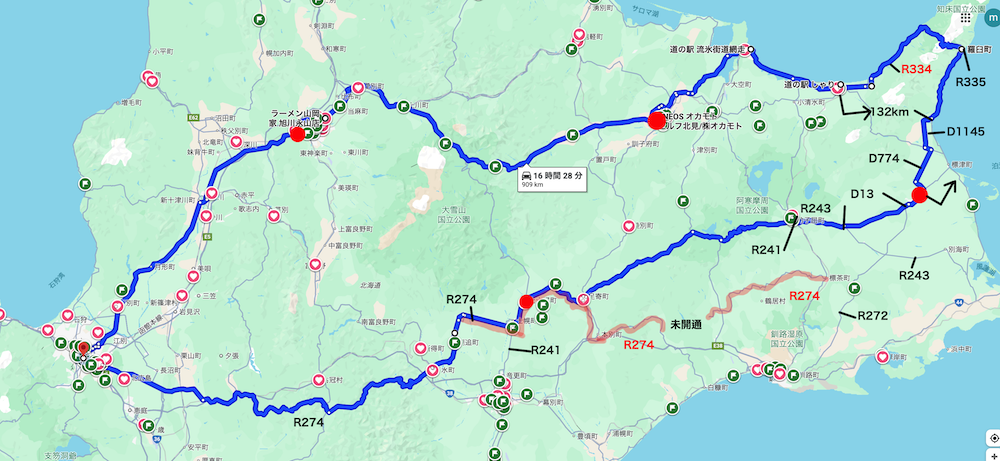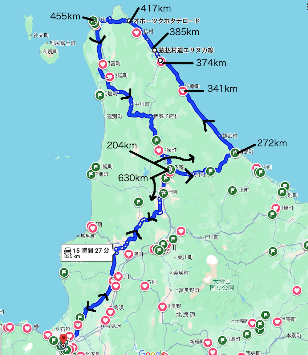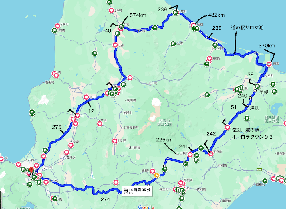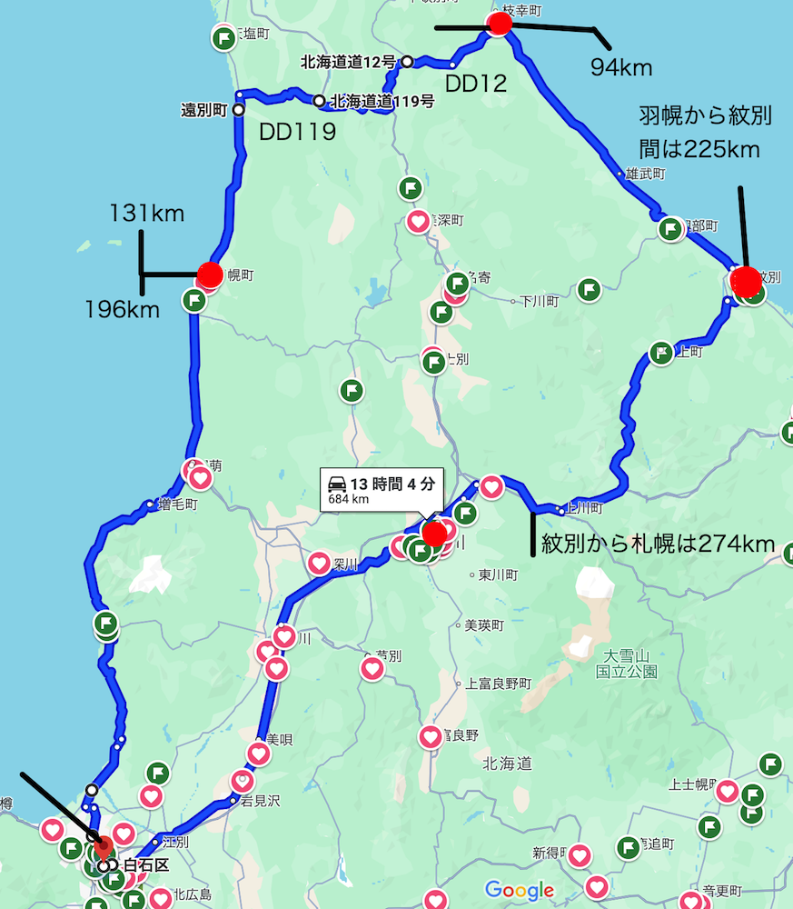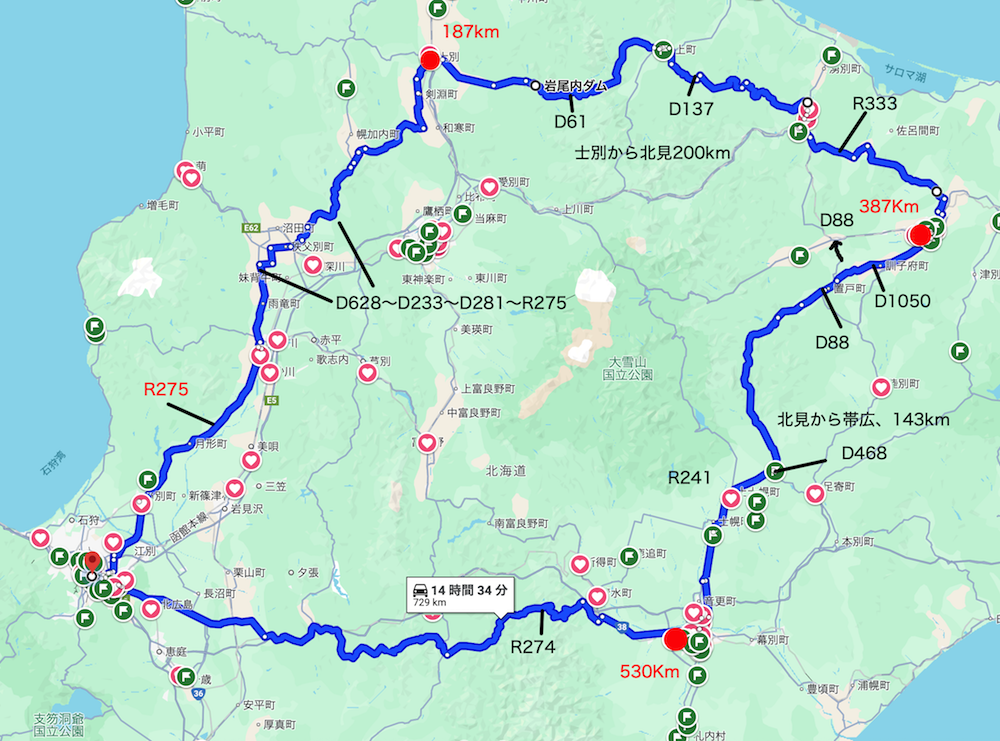 札幌--羽幌--遠別から--DD119--R40--R275--DD12---枝幸---紋別---滝上---上川---旭川---滝川R12---札幌