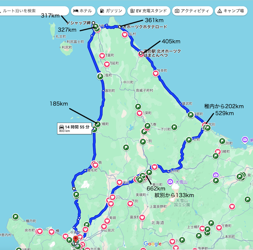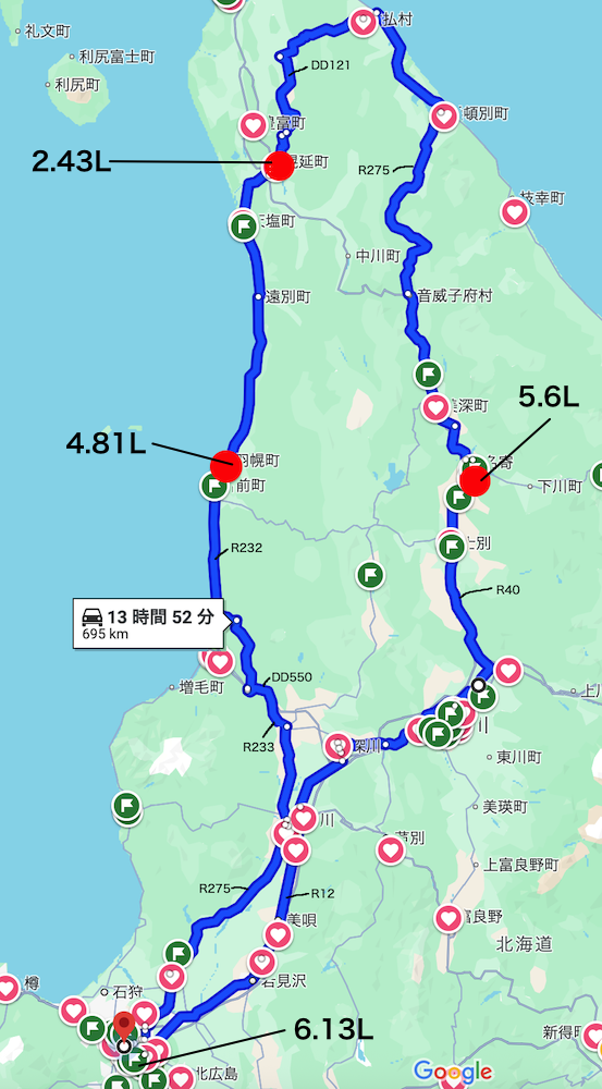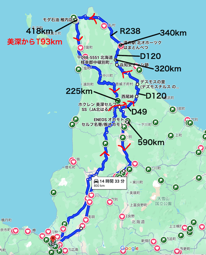 今日は下着をヒートテックの上下。モンベル WIC.O.D.シャツ、モンベルの薄いベスト、今日は暑かったのでコロンビアのジャケットにした。ヒートテックの靴下、ユニクロ ヒートテックイージーパンツ。帰路、ワークマンFieldCore WM3634を履いたもうこれで十分な気もするが、ワークマンFieldCore WM3634は防水でないので濃霧や小雨の時にカッパが必要になる。 札幌からは羽幌で給油し、稚内で給油すれば紋別まで走れる。