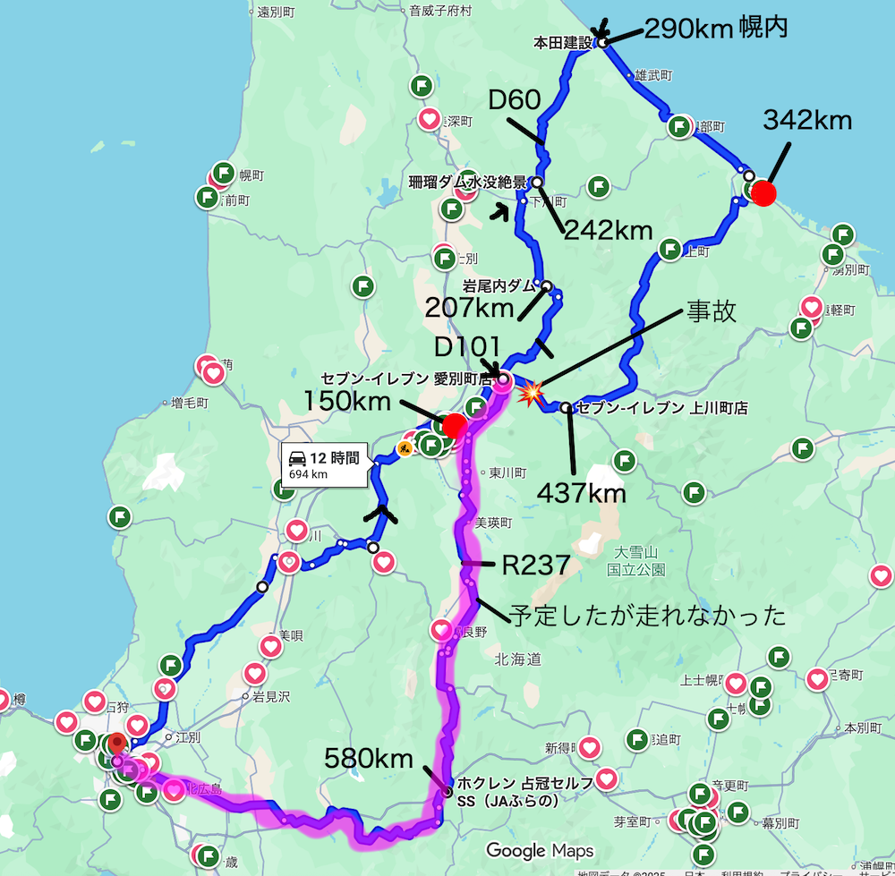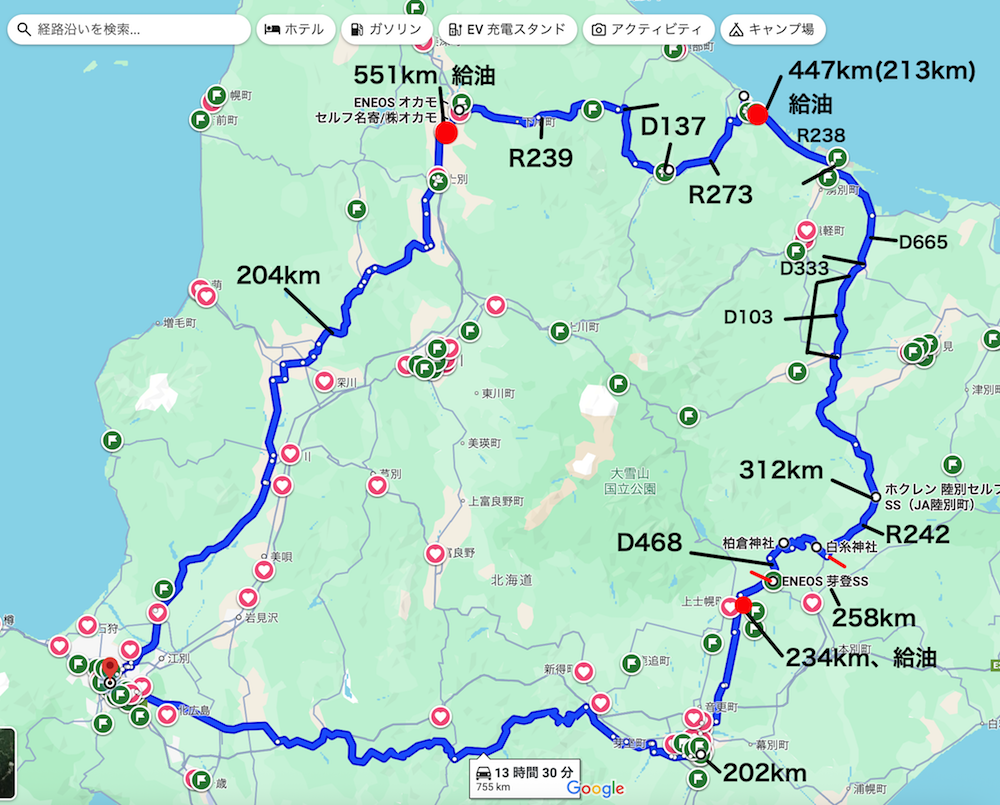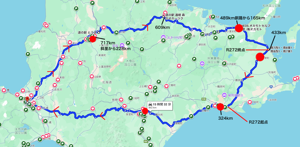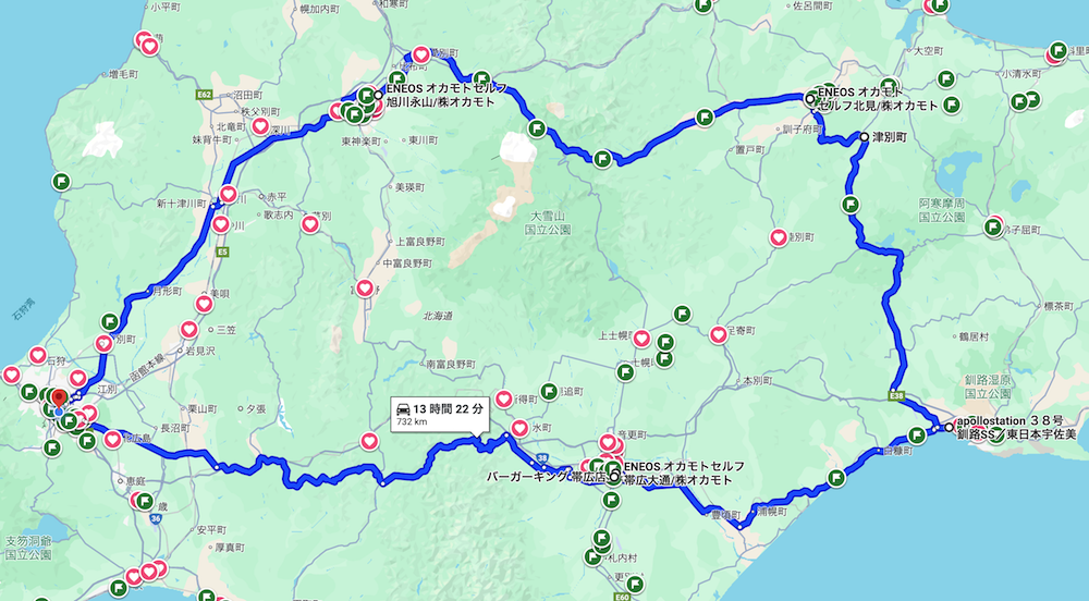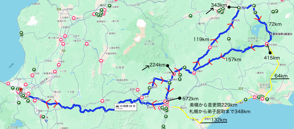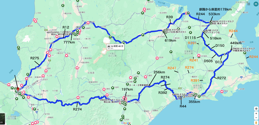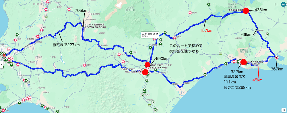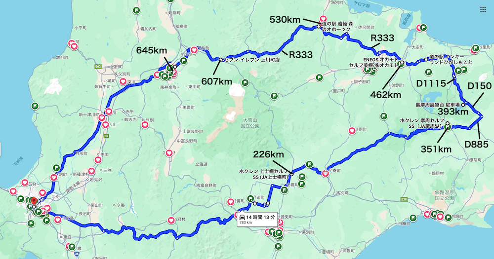 8:55出発、音更に12:51(給油)、上士幌13:35(お昼)、美幌16:2(給油)、弟子屈17:55(給油、壊れる)、帯広22:05(給油)、帰宅わ02:51、メーターは12,2015.5km