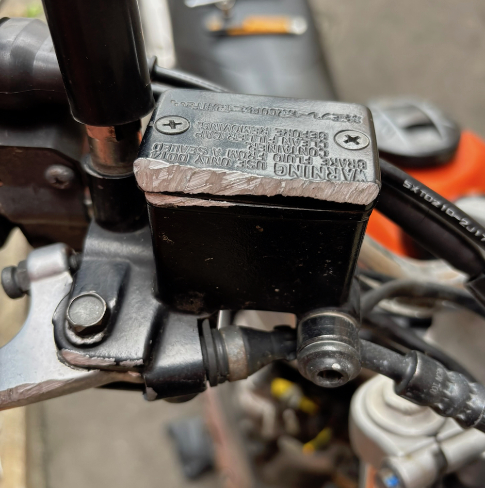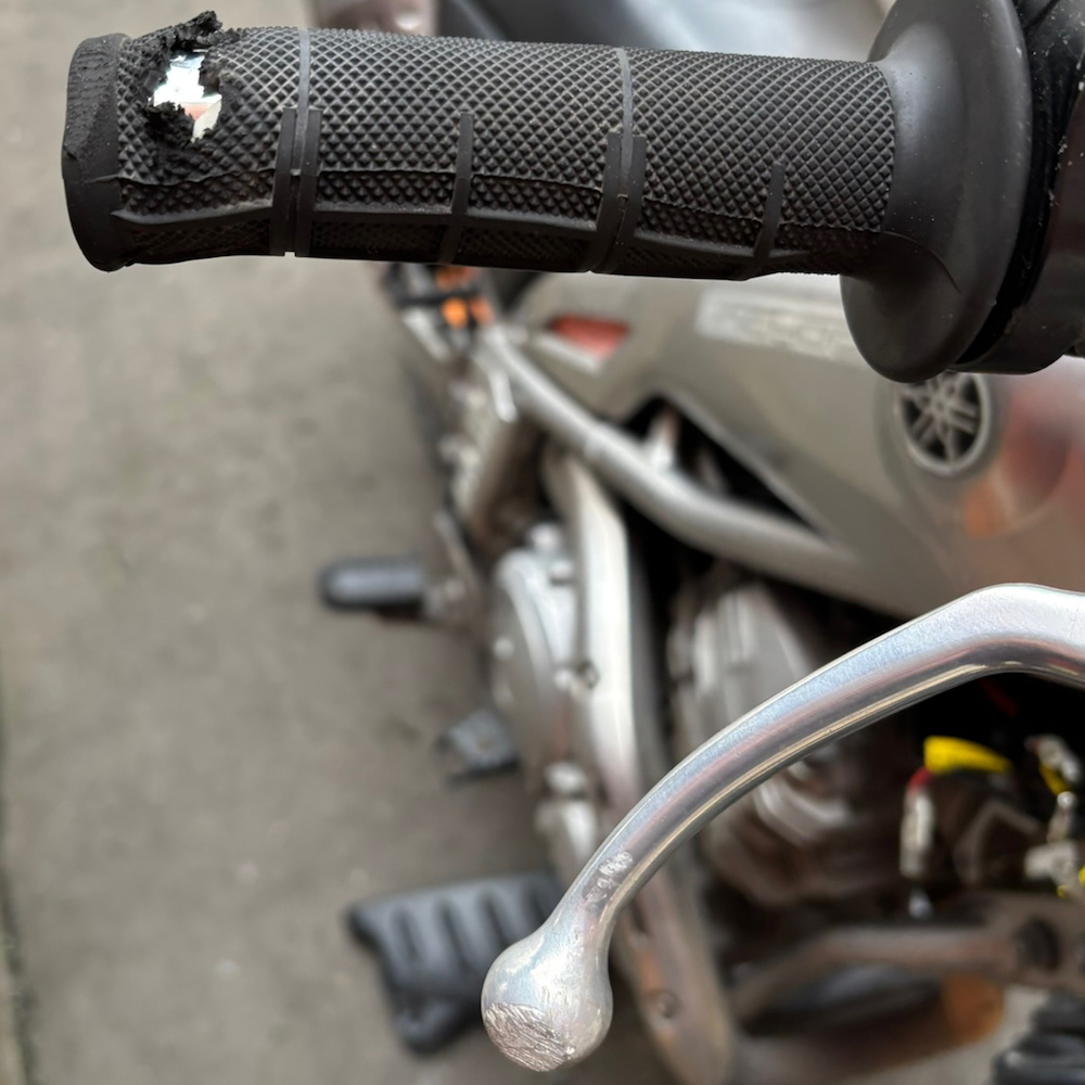 バイクを確認したところ、メーターのカバーが吹っ飛んでいた、ヘッドライトにほんの少し傷、ライトケースが割れていたのでコンプリートで交換だ、さらにライトステーが曲がっていた、フォグランプステーは折れていた。ブレーキレバー、ブレーキマスターシリンダーが激しく削れていた。 フェンダーがねじれていた。フロントフォークもねじれていたが、曲がりなどはない感じた。フロントホイールはまだ未確認、右側ステップの底が削れていた。ハンドルは多分曲がっていると思う、スロットルガイドチューブが割れていた。