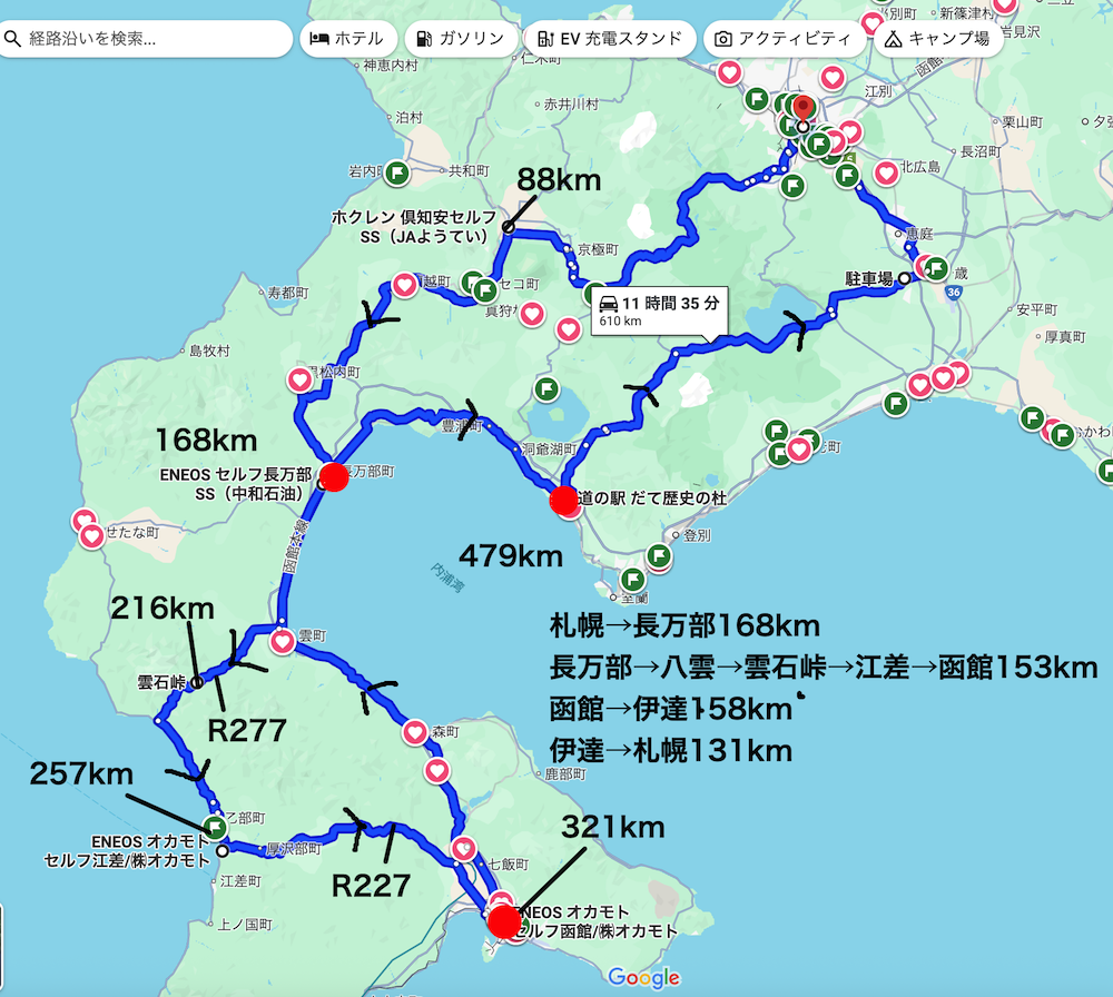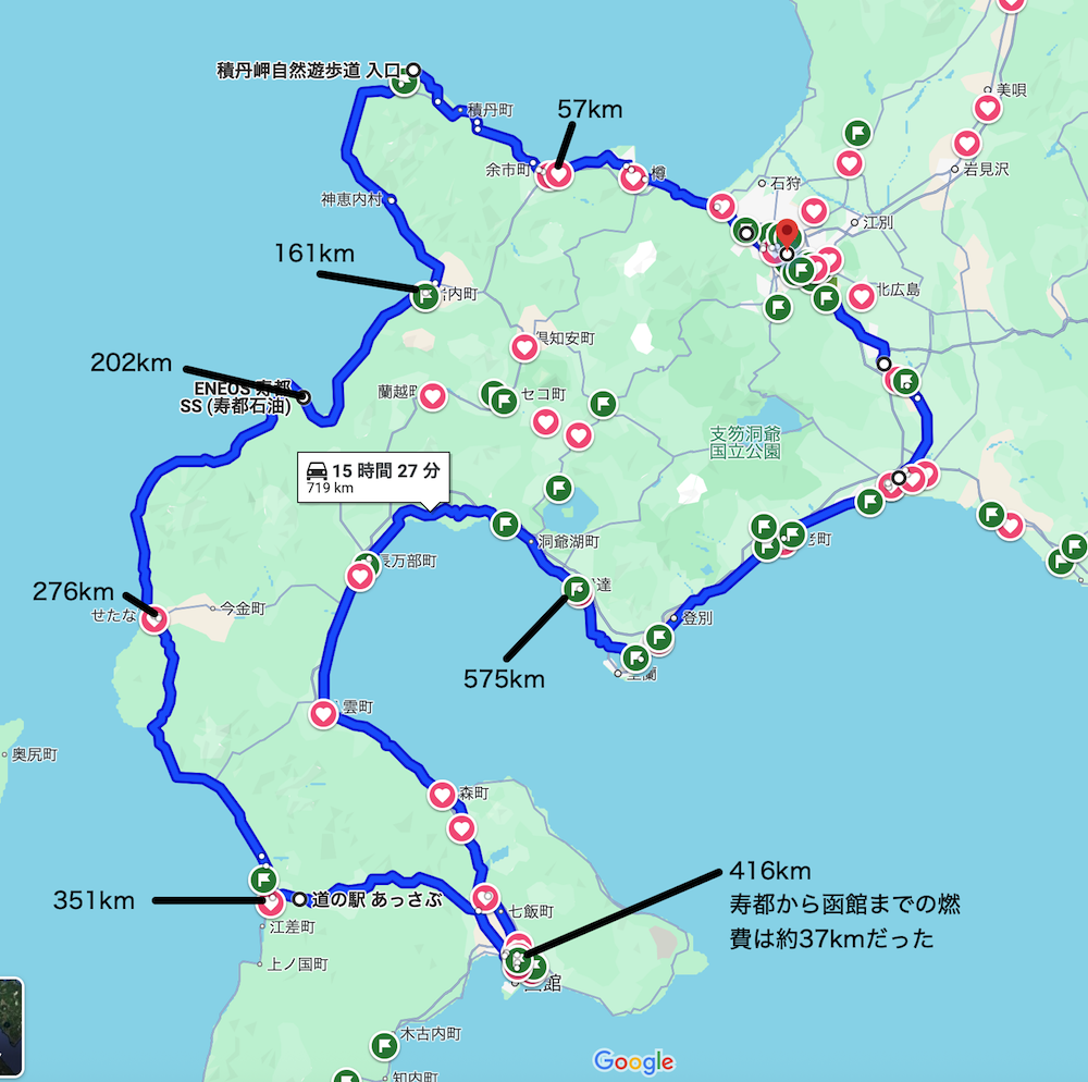 寿都から函館までの燃費は約37km/L。 メーターは119762.6km(約713km走行)