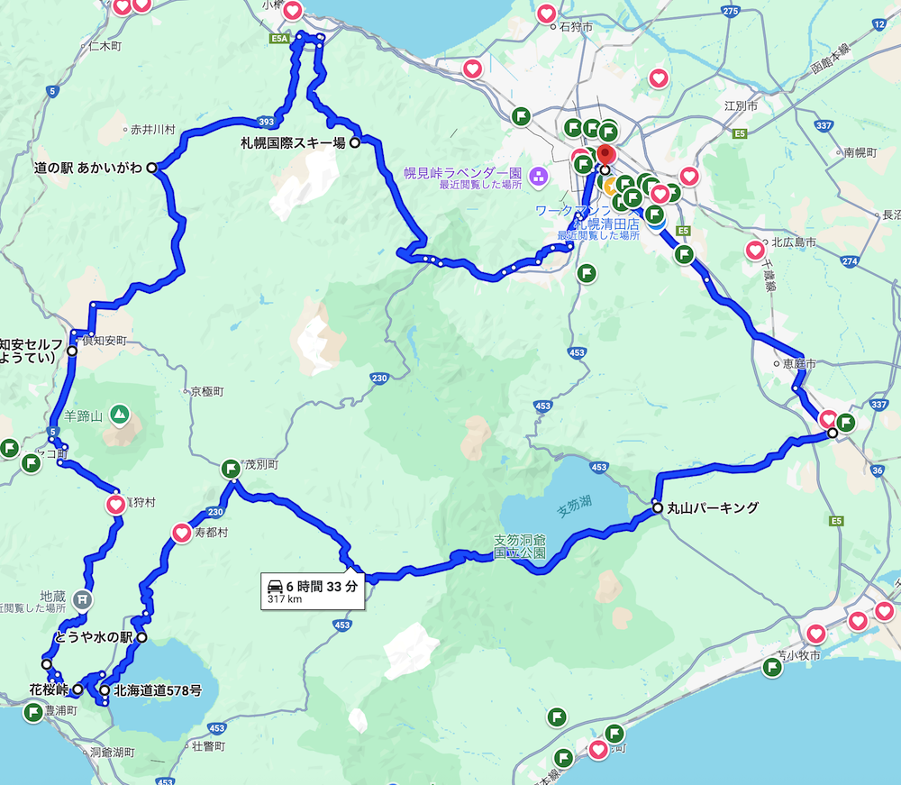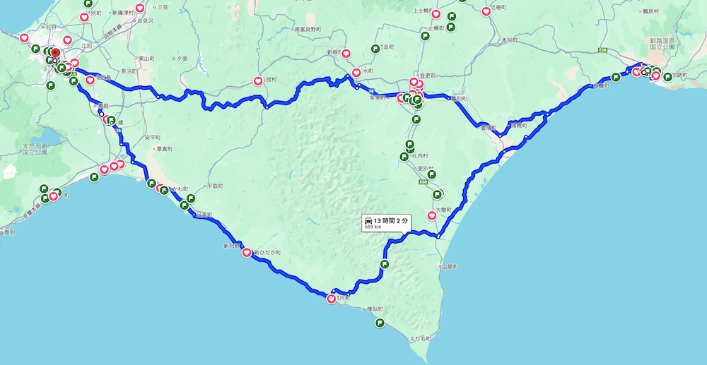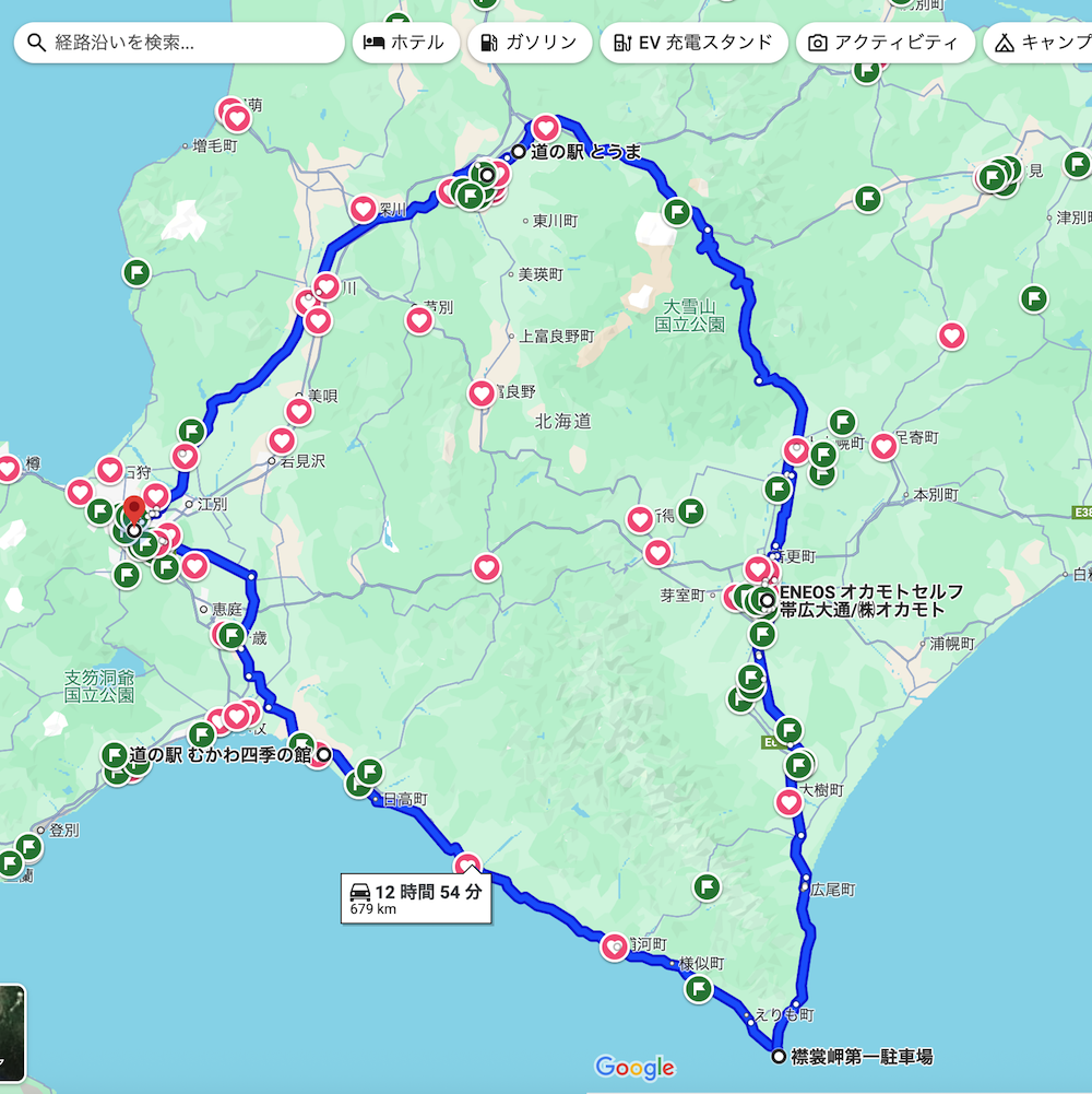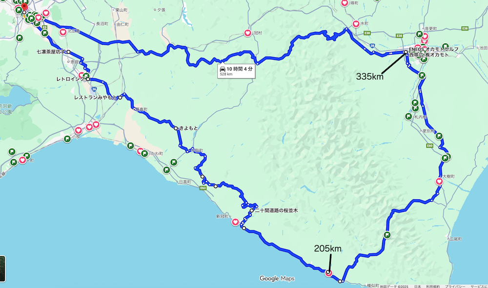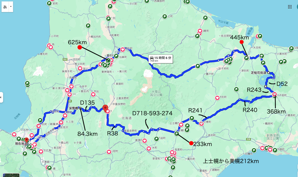 今日は暖かくツーリング日和かと思いきや、やっぱり北海道。ずーっと風が強く、長距離を走るには不向きだった。9時40分ころ出発。5月5日に走る予定だった、美唄から富良野に抜ける道道135号を走りに行った。道道135号は2024年8月26に未開通となっていた美唄市美唄ダムから芦別市三段滝までの区間が開通した道路。途中には炭鉱メモリアル森林公園がある。今日はここが目的ではなかったので素通り。5月5日に行ったひがしもこと芝桜公園に今日は弟子屈側から訪れるツーリング。美唄から富良野、南富良野に抜け、ここの道の駅で昼食を食べた。南富良野から士幌の道の駅までをナビに入れるとR38から新内ホール方面に左折し718号にでる、かなりローカルなルートをナビが選択する。風が強く燃費が悪い、一度南富良野で給油、士幌、足寄、阿寒湖、弟子屈へと順調に走る。気温が高く快適。弟子屈の道の駅で、グローブをミズノのゴアテックス手袋に、オーバーパンツ、ワークマンAEGIS防水防寒サーマルパンツ(AG1004)を履き寒さ対策。弟子屈の道の駅に着いたのは17時前だったので、観光客も多かった。弟子屈から屈斜路湖 湖畔を走り藻琴山 展望駐車公園、ひがしもこと芝桜公園へと向かった。着いたのは17時30分ころで公園はもうしまっていて中には入れなかったが、今日はほぼ満開か。目的地に到達したので後は帰るだけ。美幌から、北見に抜け、すき家で食事。留辺蘂の道の駅で休憩。R39をひたすら旭川を目指して走る。今日のR38は鹿が多く、何度もスピードダウン。ハンドルを交換したので、フロントブレーキの効き悪い、しかもリアブレーキの効きも良くない、フロントフォクのオイル交換時に取り外し、配線の接続部分をハンダ付けしたフォグランプの高さや向きも悪い。戻ったらまた整備しよう。北見からは寒く、旭川で給油し、滝川の道の駅で休憩した時に、ネックウォーマーを装着した。24時とともに街灯が消えた。ここで持ってきたカロリーメイトやゼリーを食べた。イャフォンを装着、眠気覚ましに音楽を聴きながら走ることにした。滝川を過ぎてまもなく雨、かなり激しく降っていたが上下とも防水なのでそのまま走り続ける。靴の中に少し浸水した。