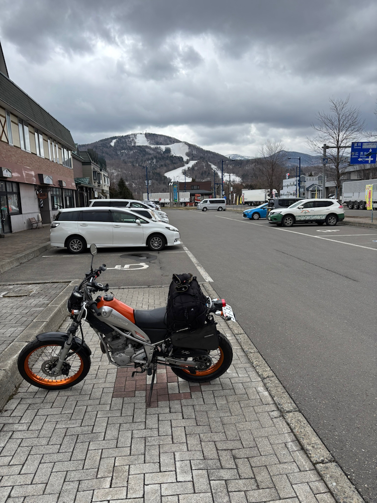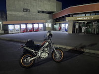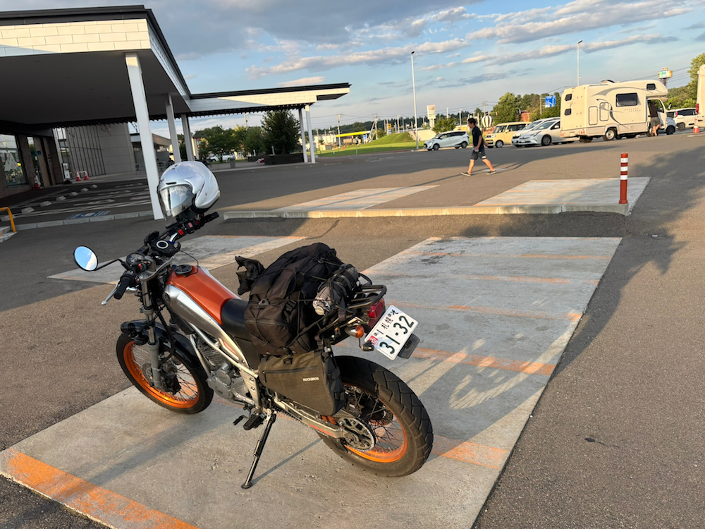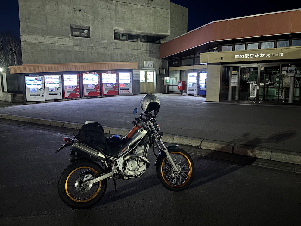 壊れたのはサイドスタンドとクラッチレバー、ハンドルも少し曲がったか。スタンドのないバイクはブレーキ側のクリップを壁などによりかけてしか停めることができない。とりあえず、クラッチレバー交換のため近くの道の駅に行くことにした。道の駅の障害者用の駐車スペースは囲われていて、この囲いによりかけて停めた。そしてクラッチレバーを交換した。北海道は数少ない大きな街を出ると何も無い所が多いので、多少のことがあっても帰れる準備はしてあったので、ブレーキやクラッチレバーは予備を持っていた。積んでいた荷物のおかげでサイドスタンドとレバー以外はほとんど被害はなかったのだが、問題は、お店や、食堂、休憩スペース、ガソリンスタンドなどで停めることができない。札幌まで残り約340kmぐらい。今の時間は19時過ぎ、もうすでに日が沈み、しかも寒くなってきた。ぐだぐだしていてもしょうがないので、走り始める。弟子屈町から阿寒湖までは雨の峠道、しかも大勢の鹿が路上でたむろしている。鹿にぶつからない様にゆっくりと走り、寒さで膀胱がパンクしそうな状態で、やっと足寄町の道の駅に着いた。駐輪スペースの壁によりかけて駐車。トイレに行き、持ってきたお茶とカロリーメイトで食事。もっと食べ物を持ってくれば良かったと後悔するが、すでに遅い。ここでカイロを入れて、手袋を電熱に変えた。すでに手足が冷たくてなっていたが、駐車場などでは停めることができないので道の駅までガマンするしかない。途中の休憩はバイクに跨ったままで立って休憩、バイクから降りることができない。空腹で体力が落ちていたので日勝峠はとくに寒い。バイクもパワーがなくなってきた感じだ、取り付けたフォグランプの一灯が点いたり消えたり、内部の接触不良なのだろうか、去年の8月に付けたばかりなのに。寒さに震えながら走行中、頭の中は帰宅してからバイクをどうやって停めるかばかり考えていた。約8時間かけてやっと帰宅した。もうぐったり。結局ジャッキーで支えるしかできなかった。サイドスタンドを注文して届くまでの1週間、倒れないこと祈るばかりだ。